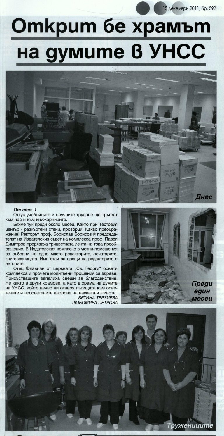 Between 1990 and 2000, the university publishing house underwent a transformation in response to the new academic and market environment in Bulgaria. The thematic scope of its publications expanded, and during this period the printing house and publishing activities were consolidated into the UNWE Publishing Complex.